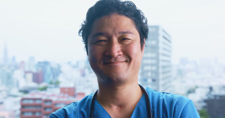 Asian, happy man and nurse with portrait for healthcare service or medical assistance at hospital in city. Japan, male person or doctor with smile for nursing internship, medicine or career at clinic