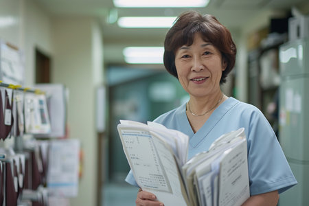 Nurse, clipboard and portrait of Japanese woman with smile, document and medical checklist in hospital. Surgeon, nursing and paperwork for health, wellness and clinic care with professional at job
