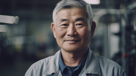 A smiling senior Chinese male electronic factory worker standing in factory. Generative AI AIG19.