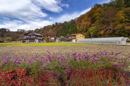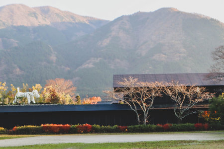 Scenic Countryside View in Japan with Contemporary Black House and Autumn Colors