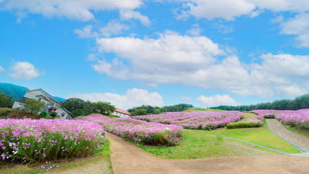 Scenery of blue sky and cosmos flower garden