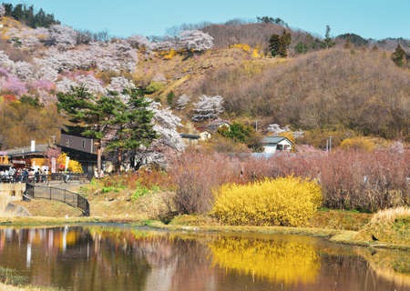 Multicolor flowering trees covering the hillside,Hanamiyama Park,Fukushima,Tohoku,Japan.