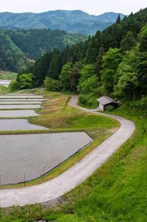 Japanese rural landscape with rice paddy terraces among mountain forest. Yotsuya No Semmaida rice fields. Shinshiro, Aichi prefecture, Japan