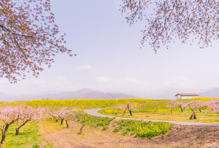 cherry blossoms and pasture in hokkaido