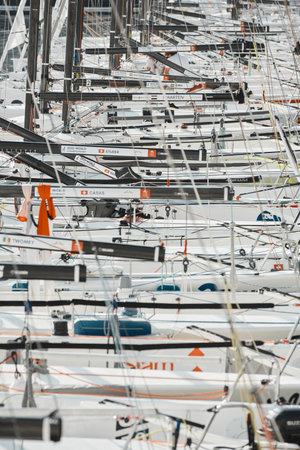 Monaco, Monte-Carlo, 18 October 2022: many sailing boats of the World Championship of J70 class participants stand in a row waiting for the wind for the stage of the sailing race