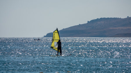 Gokceada, Canakkale Turkey July 29, 2023; Wind surfers enjoying the Aegean sea and the wind in Gokceada Kefalos bay against the clear sky. Imbros Island.