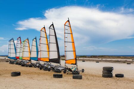 Race track on coast with sailing buggies in a row