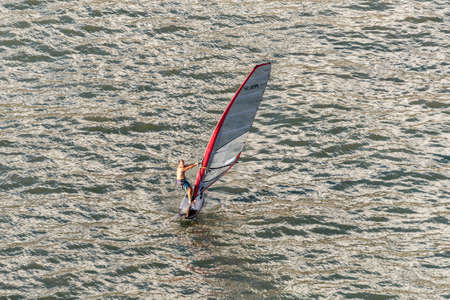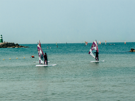 Eilat, Israel - November 7, 2017: Surface water sports: girl on Windsurfing. Windsurfer sailing in the gulf of Eilat, Red Sea in Israel.