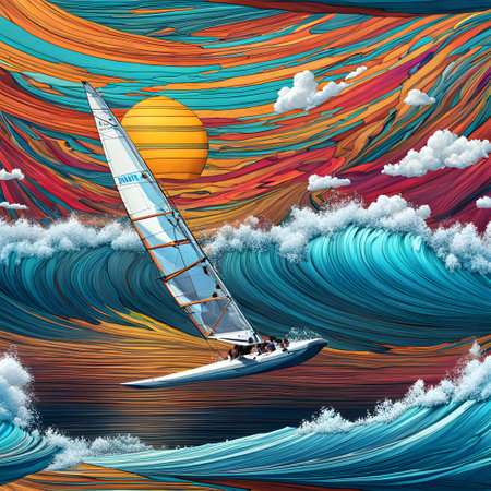 Men sail into the sunset, surfing waves generated by artificial intelligence