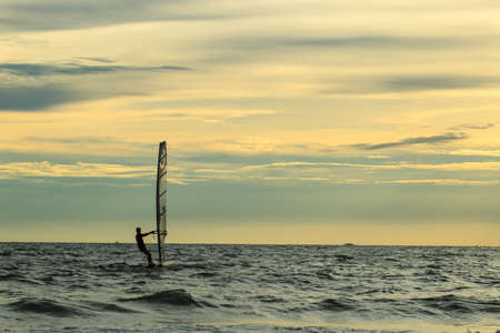 Windsurfer in the sea at sunset. The concept of extreme sports