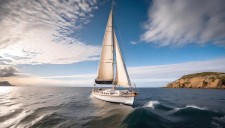White sailboat gliding across the azure ocean, embracing a relaxing summer day at sea