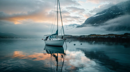 Small sailboat glides across the calm waters at sunset, beautifully reflecting in the stillness of the evening. Generative AI