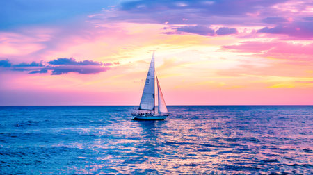 Sailboat moving on water at sunset with pink sky and sun reflections Clear details and vibrant colors enhance...