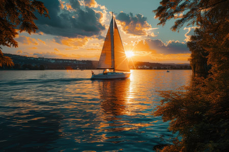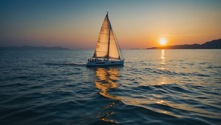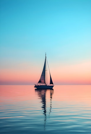 Tranquil Sailboat Gliding Across Calm Waters Under a Stunning Sunset with Reflective Colors