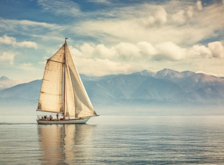 Sailing boat in the sea against the backdrop of mountains Created with Generative AI technology