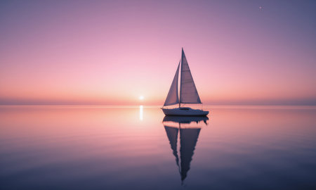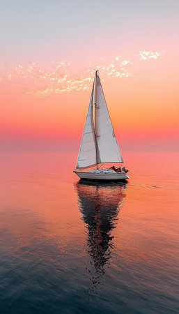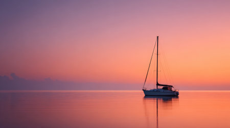 Sailboat with lowered sails is floating on calm sea reflecting beautiful pink and orange sunset sky, creating a peaceful and serene atmosphere