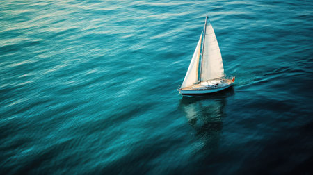 A small sailboat glides effortlessly across tranquil blue waters, creating gentle ripples in the surface.