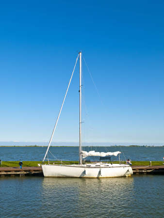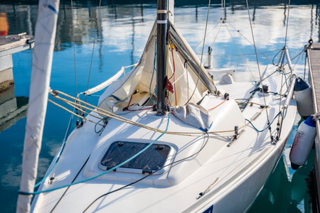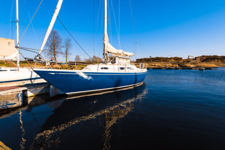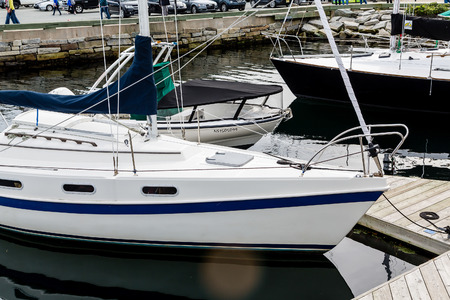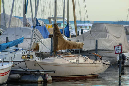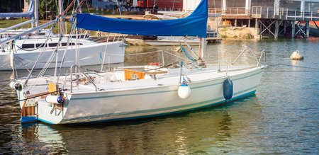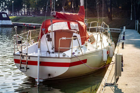 Sailboat moored to a pier in a yacht marina after winterization. Vacations, transportation, sport, recreation, tourism, cruise, port service
