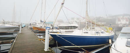 Sailing boats moored to a pier in a thick white morning fog at sunrise, close-up. Yacht club in Kiel, Germany. Sport, recreation, transportation theme