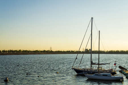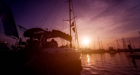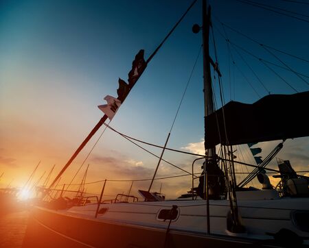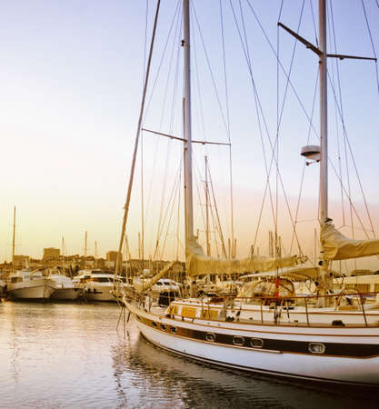 Beautiful view of marina and harbor with yachts and motorboats. Sunset at the ocean. Background