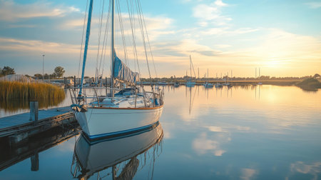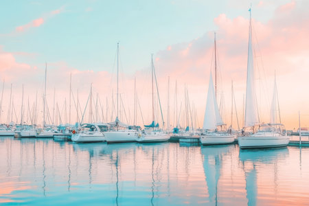 Serene marina scene sailboats with white sails on clear water under a pastel sky