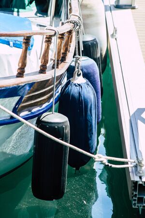 Yacht side with mooring fenders.