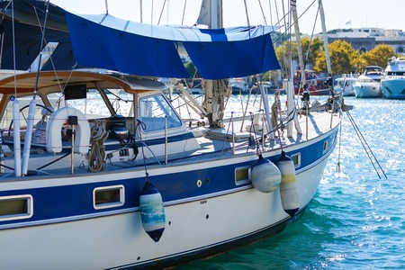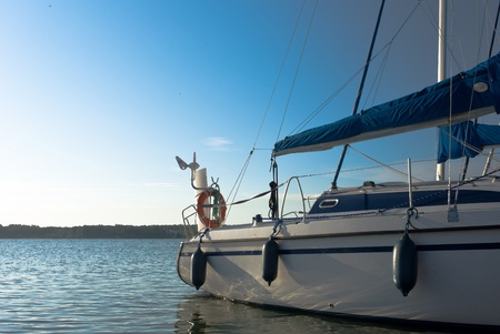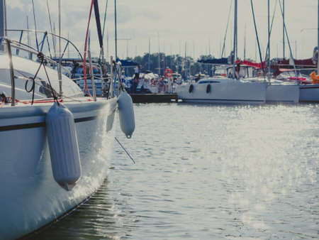 White yacht in a harbor.Close view. Lithuania.