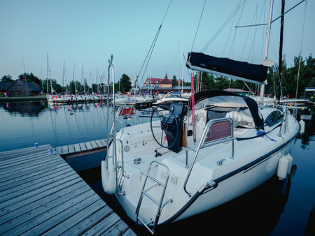 sailboat moored on wooden jetty in the port at the evening time
