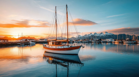 A breathtaking sunset casts a warm glow over a serene marina, with sailboats gently bobbing in the calm waters. The vibrant hues of orange and pink reflect beautifully on the waters surface, creating a picturesque scene that evokes peace and tranquility.