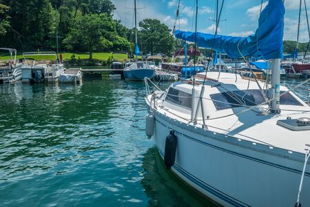 Closeup of a white sailboat moored at the dock with pontoons and other boats at the marina in the background on a bright sunny day in summer