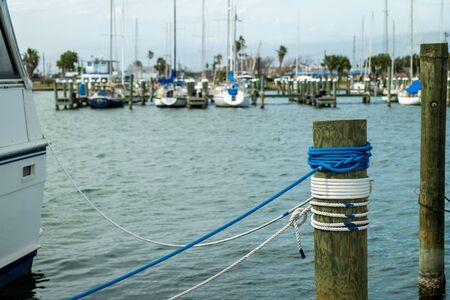 Nylon nautical marine rope, blue and white, is tied to a yacht and is wrapped neatly around a wooden pole on a marina pier.
