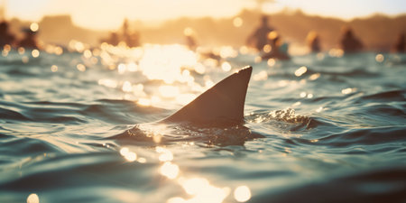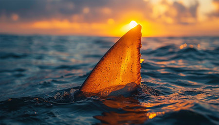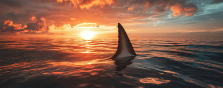 Shark fin against a dramatic sunset on the ocean horizon, wildlife and adventure concept