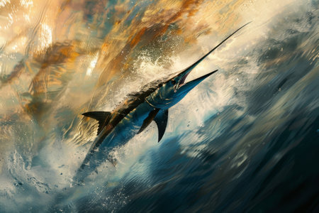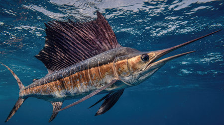 an underwater view of a sailfish in the ocean near the surface, with sunlight filtering through the water above, showing the beauty and dynamism of marine life