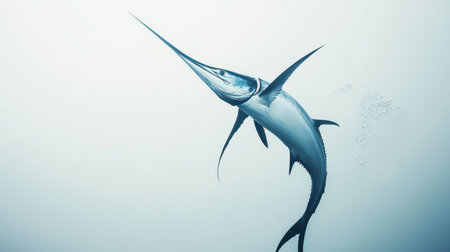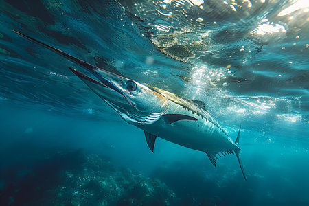 Marlin swimming gracefully in deep ocean, ethereal underwater scene. Marine life and ocean habitat concept