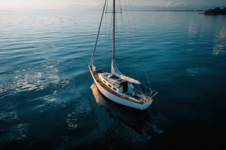 Serene aerial view of a sailboat anchored on flat calm seas during early morning light, showcasing tranquility and natural beauty in open waters