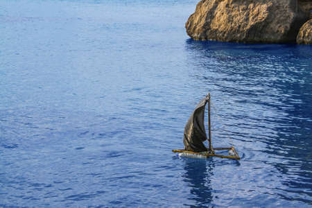 Self-made sailing boat, running on the sea waves away from the coast against the backdrop of the picturesque cliff.