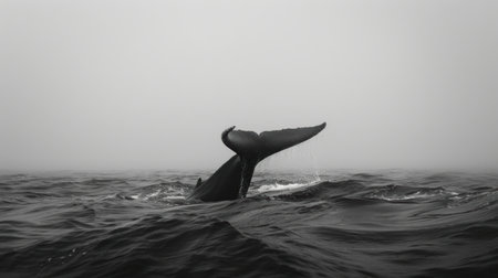 A whale lifts its tail gracefully above the misty water in the calm morning