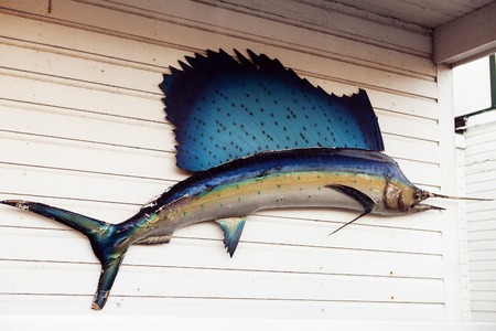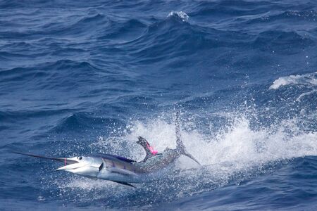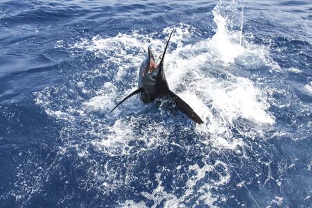 Sailfish in a spray of water tries to free itself from the hook. Sea fishing on big fish.
