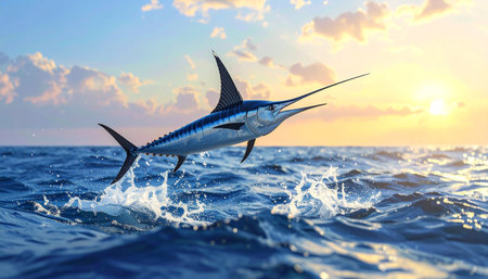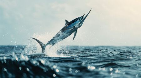 An action-packed image of a blue marlin swordfish soaring through the air, set against a white background, perfect for ocean-themed projects