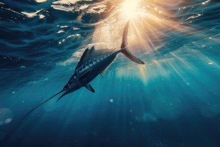 A sailfish is depicted swimming in deep blue water, illuminated by beams of sunlight. The image showcases the fish's distinctive sail-like dorsal fin and streamlined body. The composition focuses on underwater life, emphasizing the interplay of light and shadow, suitable for various editorial and commercial applications.