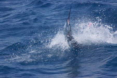 Blue marlin fish jumping out of the water.