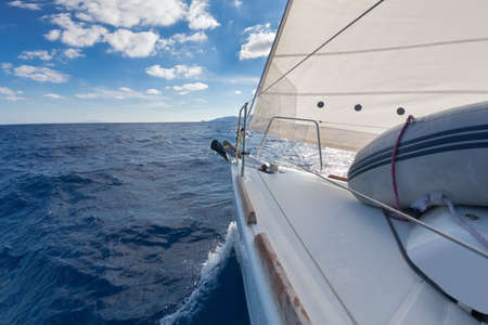 Yachting on sail boat bow stern shot splashing sea water. Sporty transportation conept.