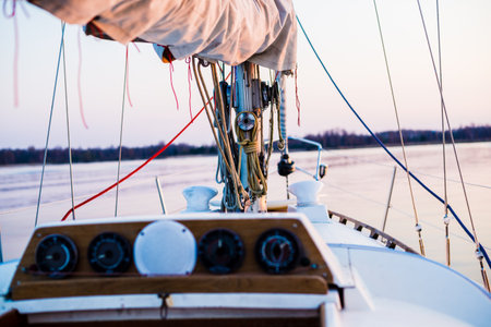 Sailboat deck at sunset: close-up view of ropes and equipment on ocean