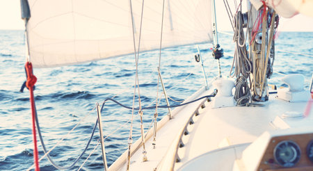 White sloop rigged yacht sailing at sunset. Clear sky after the storm. View from the deck to the bow, mast, sails. Transportation, travel, cruise, sport, recreation, leisure activity, racing, regatta