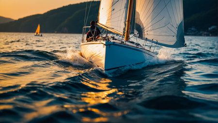 Sailing boat sailing fast into the sunset on choppy sea