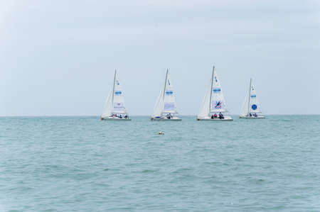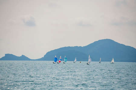 Sailing Yacht boats to race at Ao Dongtan or Dong tan beach in Sattahip, Chonburi province, Thailand. Famous place to do regatta. Extreme sport for bodybuilding and healthy lifestyle.