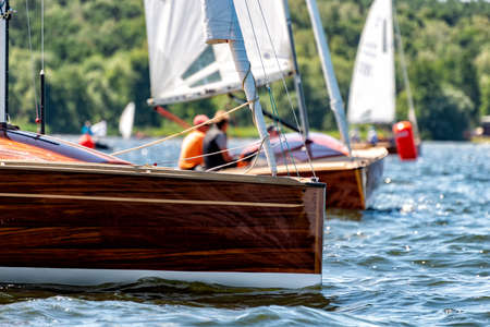 Small sailing yachts sail in the blue sea. Group of sailing boats during race