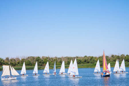 ASTRAKHAN, RUSSIA - AUGUST 31 2014: Sailing boats in the summer on the Volga River, Astrakhan, Russia, 2014
