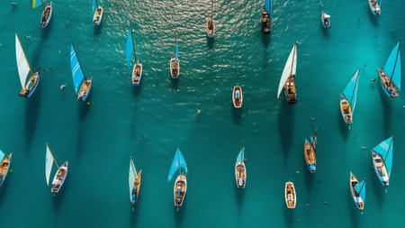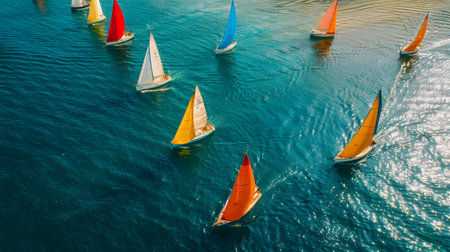 Aerial view of small boats in an eco-friendly regatta, colorful sails reflecting sustainable practices. Nautical event for World Oceans Day.