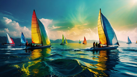 The race of sailboats, a regatta, reflection of sails on water, Intense competition, number of boat is on aft boats, bright colors, island with windmills are on background